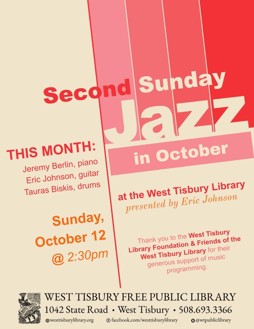 On Sunday, October 12, at 2:30pm, all are invited to a jazz concert at the West Tisbury Library featuring the Jeremy Berlin Trio: Jeremy Berlin on piano, Eric Johnson on guitar, Tauras Biskis on drums. Free and open to the public.