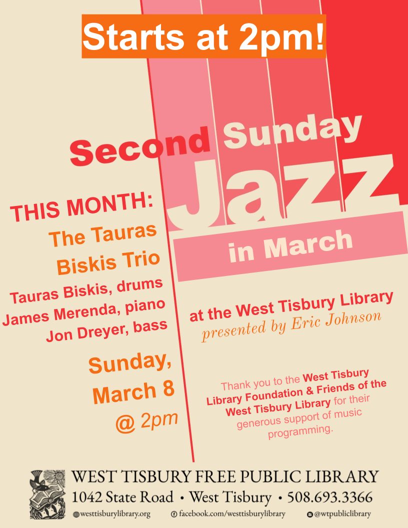 On Sunday, March 8, at 2pm, all are invited to a jazz concert at the West Tisbury Library. This month’s performance will feature the Tauras Biskis Trio: Tauras Biskis on drums, James Merenda on piano, and Jon Dreyer on bass. The event is free and open to the public.