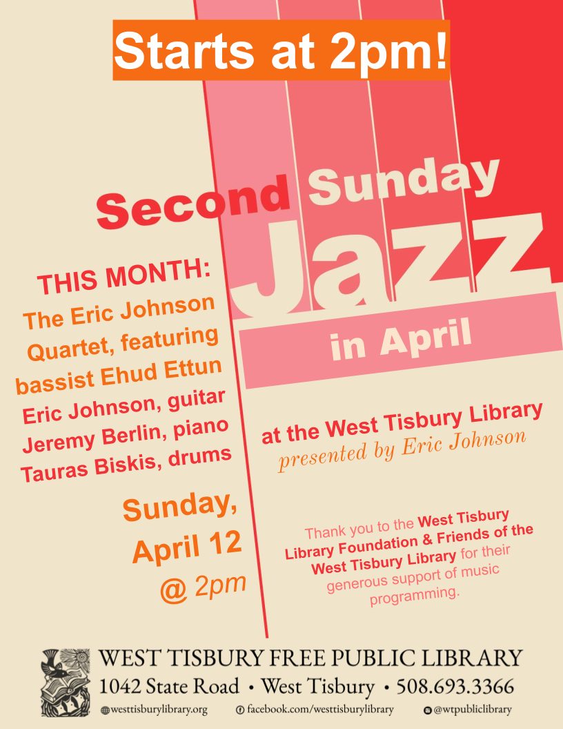 On Sunday, April 12, at 2pm, all are invited to a jazz concert at the West Tisbury Library. This month’s performance presents The Eric Johnson Quartet, featuring bassist Ehud Ettun. The event is free and open to the public.