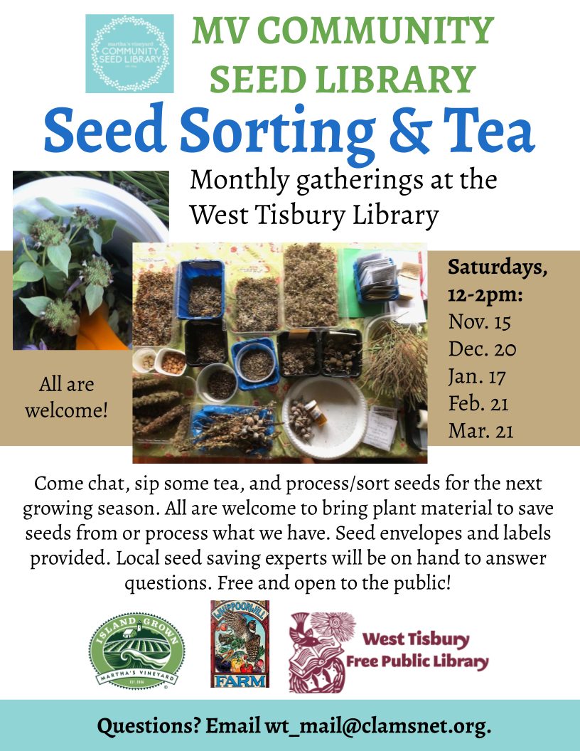 Join us at the West Tisbury Library for the MV Community Seed Library’s monthly “Seed Sorting & Tea” gatherings. Come chat, sip some tea, and process/sort seeds for the next growing season. All are welcome to bring plant material to save seeds from or process what we have. Seed envelopes and labels provided. Local seed saving experts will be on hand to answer questions. Free and open to the public!