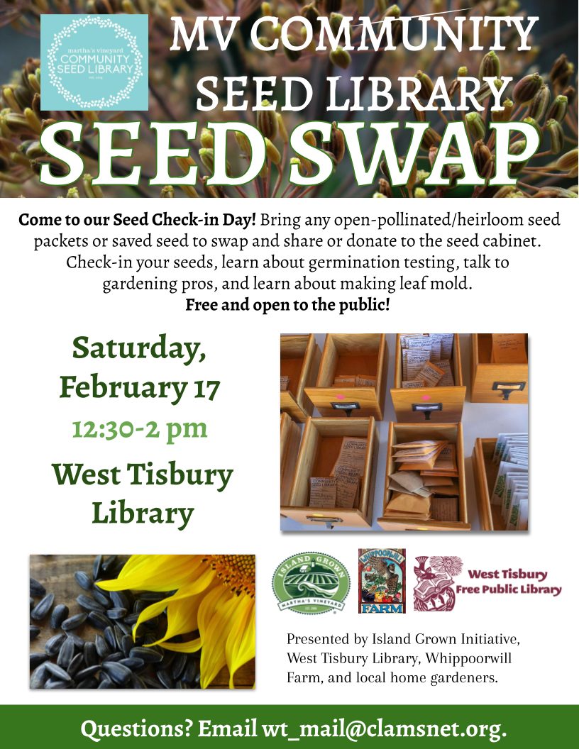 On Saturday, February 17th, from 12:30-2pm, the Martha’s Vineyard Community Seed Library will host their annual Seed Swap at the West Tisbury Library: