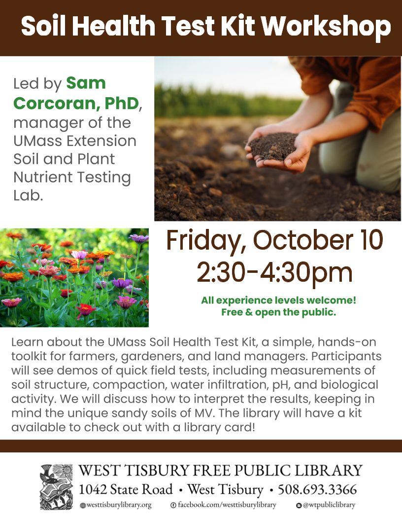 On Friday, October 10, at 2:30pm, at the West Tisbury Library, join us for a Soil Health Test Kit Workshop with Sam Corcoran, PhD, manager of the UMass Extension Soil and Plant Nutrient Testing Lab. Healthy soil supports healthy plants and healthy ecosystems, but knowing how to measure soil health can feel complicated. In this workshop, we’ll introduce the UMass Soil Health Test Kit, a simple, hands-on toolkit for farmers, gardeners, and land managers. Participants will see demonstrations of quick field tests, including measurements of soil structure, compaction, water infiltration, pH, and biological activity. We will discuss how to interpret the results, keeping in mind the unique sandy soils of Martha’s Vineyard.
