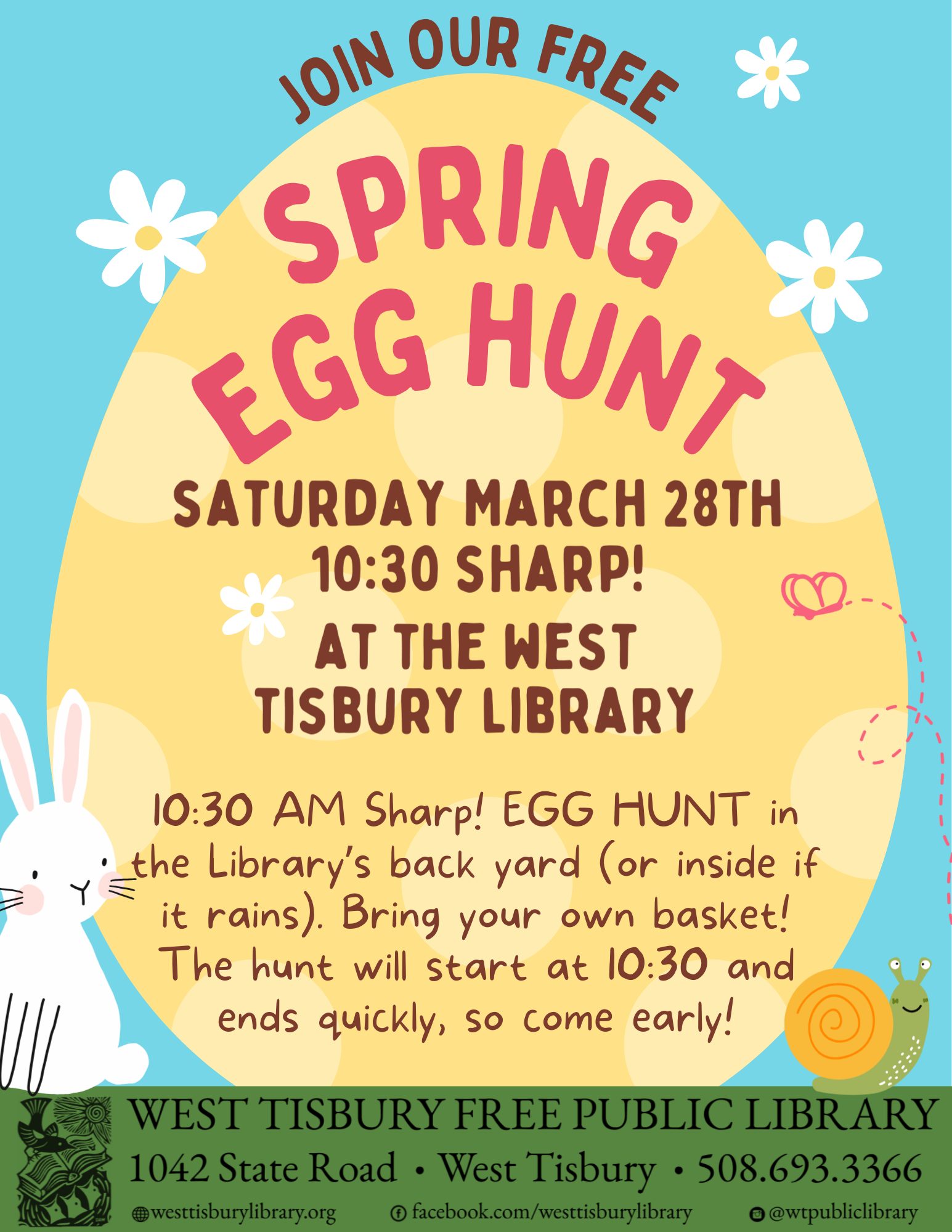 The West Tisbury Library will be hosting our annual spring egg hunt on Saturday, March 28th at 10:30am sharp, rain or shine! Gather outside the front entrance to the library. Bring your own basket for egg hunting. After the hunt, please join us in the Children’s Room for our weekly family crafts. Fun for the whole family, and free and open to the public!