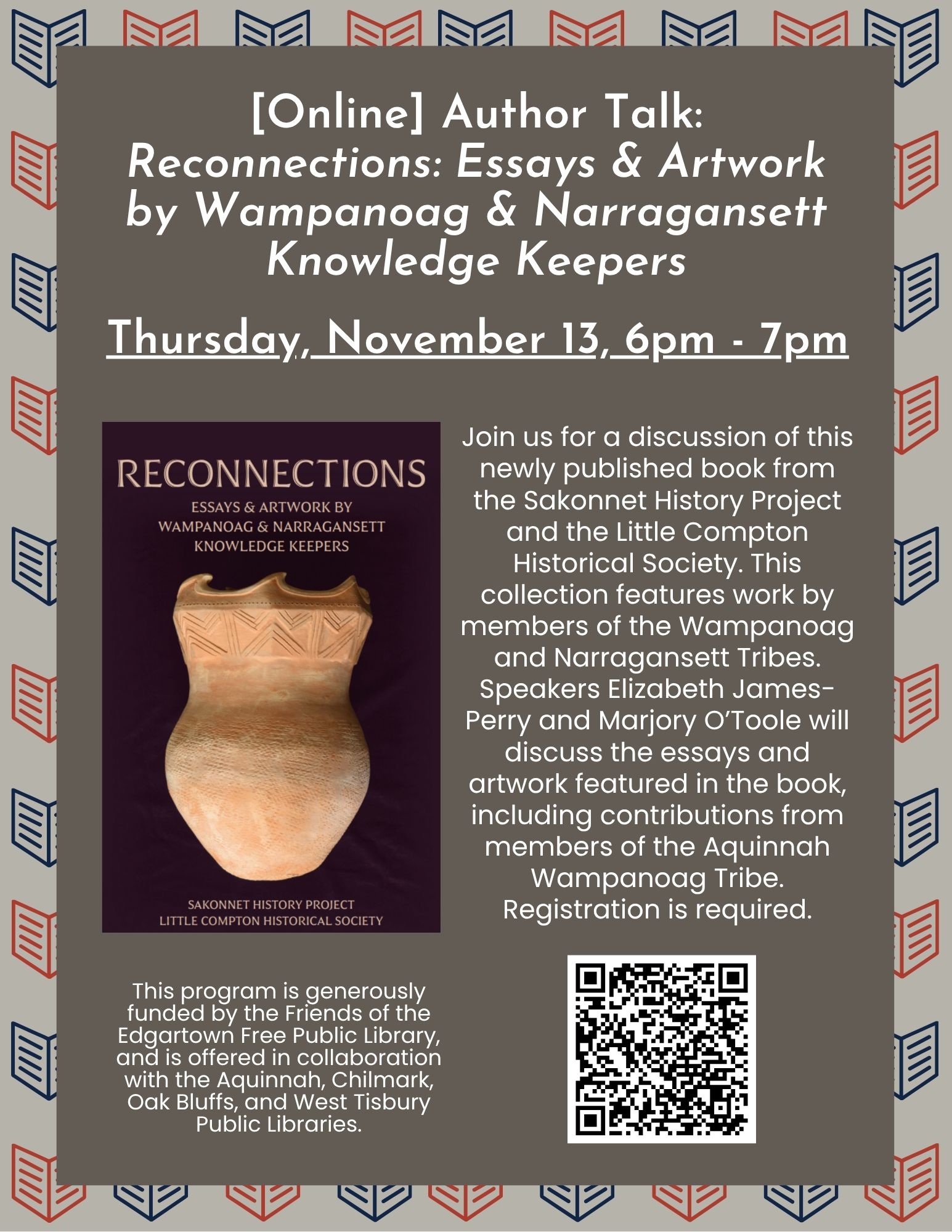 Meets on Zoom! On Thursday, November 13, 6pm, join us for a discussion of Reconnections: Essays & Artwork by Wampanoag & Narragansett Knowledge Keepers, the newly published book from the Sakonnet History Project and the Little Compton Historical Society. This collection features work by members of the Wampanoag and Narragansett Tribes. Speakers Elizabeth James-Perry and Marjory O’Toole will discuss the essays and artwork featured in the book, including contributions from members of the Aquinnah Wampanoag Tribe.