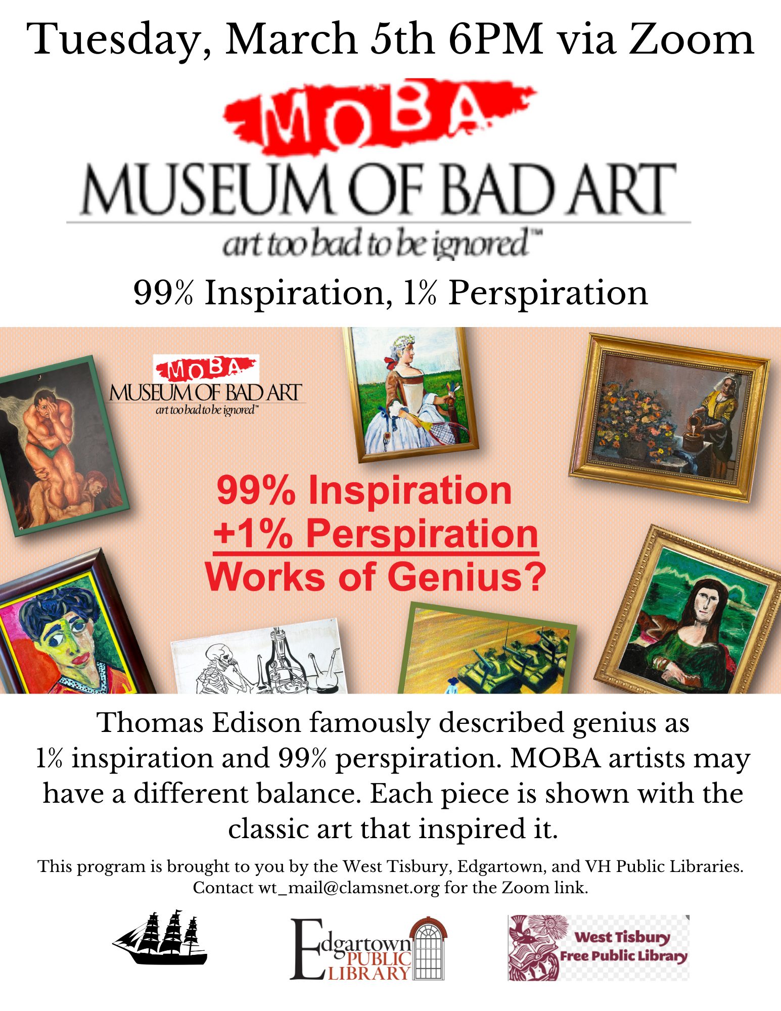 On Tuesday, March 5th, at 6pm, join us on Zoom for a presentation, “Museum of Bad Art, 99% Inspiration, 1% Perspiration.” Free and open to the public. Sign up to receive the Zoom link by emailing wt_mail@clamsnet.org.