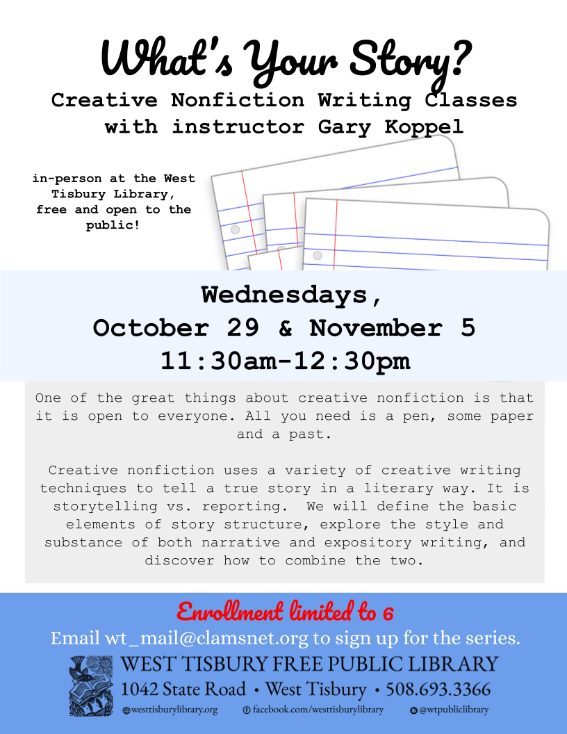 One of the great things about creative nonfiction is that it is open to everyone. All you need is a pen, some paper and a past. This fall, writing instructor Gary Koppel will offer a two-session creative nonfiction writing series. The group will meet in person at the West Tisbury Library on Wednesdays, October 29 & November 5, from 11:30am-12:30pm. Registration is required and enrollment is limited to six. Please contact wt_mail@clamsnet.org to sign up. Free and open to the public!