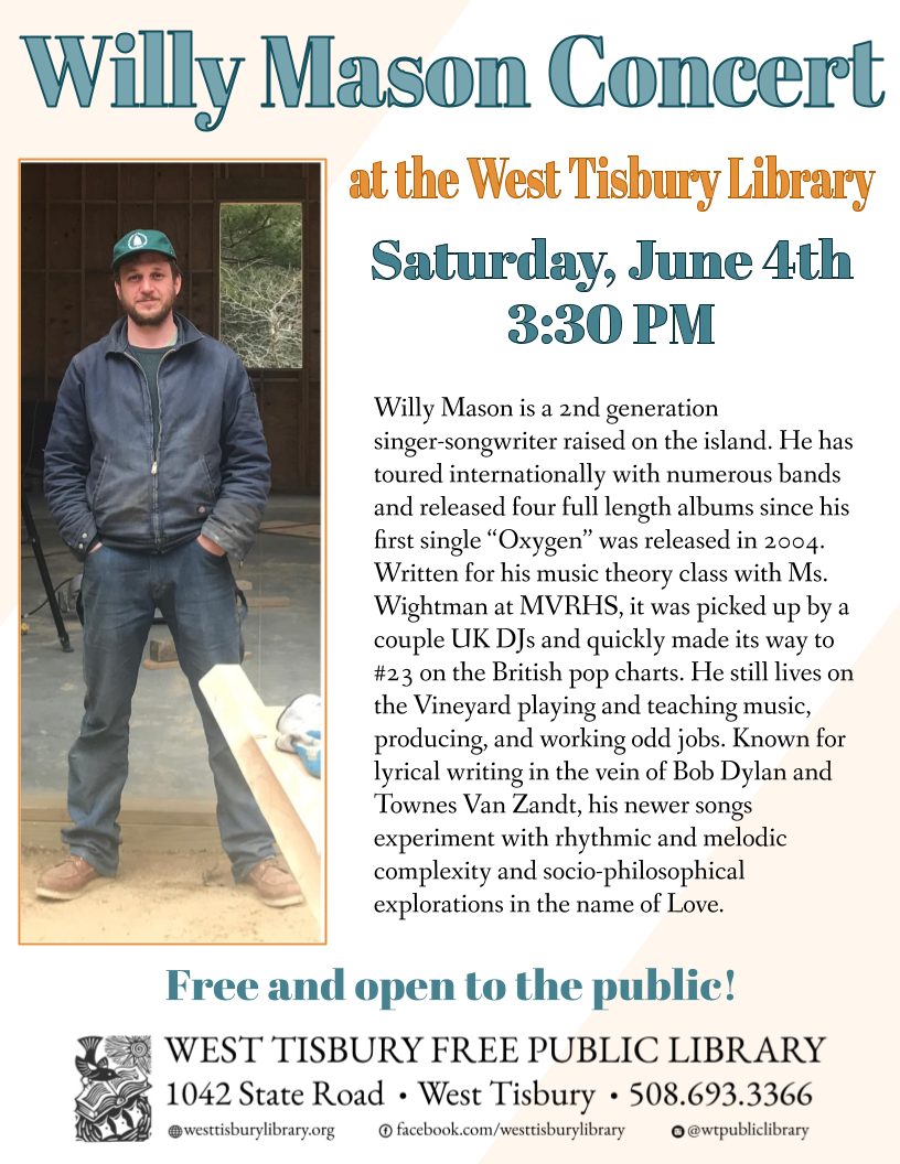 On Saturday, June 4th, at 3:30pm, the West Tisbury Library will host an afternoon of live music featuring island singer-songwriter, Willy Mason. This event is free and open to the public!