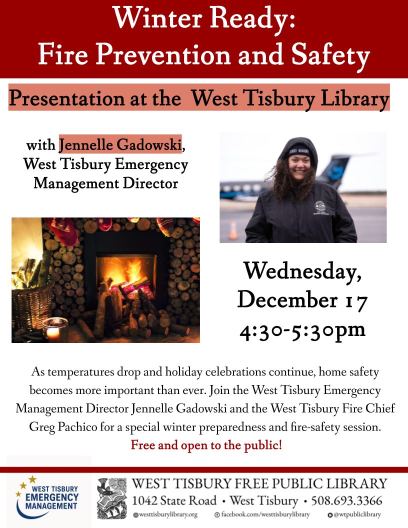 Wednesday, December 17, 4:30-5:30pm, at the West Tisbury Library, join us for a Fire Prevention and Safety Presentation. As temperatures drop and holiday celebrations continue, home safety becomes more important than ever. Join the West Tisbury Emergency Management Director Jennelle Gadowski and the West Tisbury Fire Chief Greg Pachico for a special winter preparedness and fire-safety session.