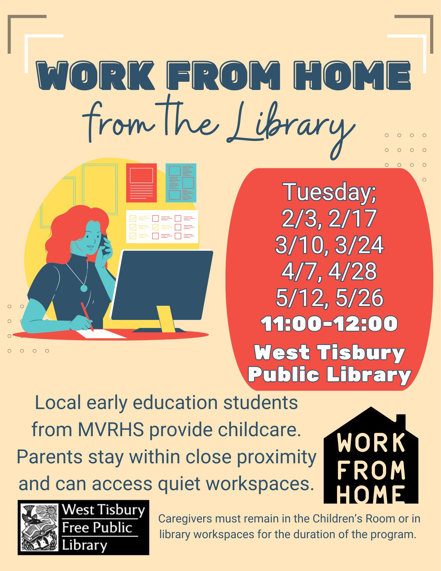 Caregivers who work remotely are invited to bring their children to the library, where they will be paired with local students from the MVRHS Early Education Program. These students, under the guidance of trained mentors and supervisors, will provide engaging, age-appropriate childcare activities to keep the children entertained and supervised. Meanwhile, parents can stay close by in the library, accessing quiet workspaces with Wi-Fi and all the resources they need to stay productive.