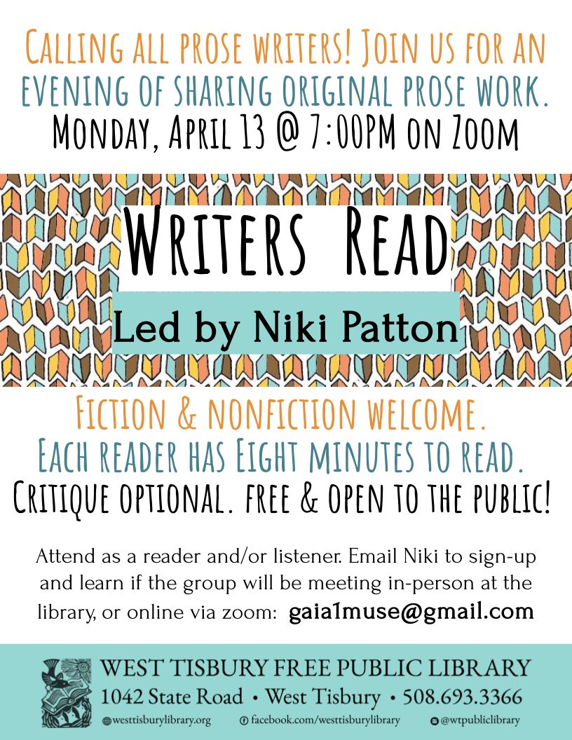 On Zoom this month! On Monday, April 13, at 7:00 PM, the West Tisbury Library will host its monthly “Writers Read” evening. This event, led by Niki Patton, features community members reading short original prose pieces. Both fiction and nonfiction readings are welcome. Each reader is allotted eight minutes to read. Critique to follow reading is optional. Free and open to the public. Email Niki to be a reader or listener at this event: gaia1muse@gmail.com.