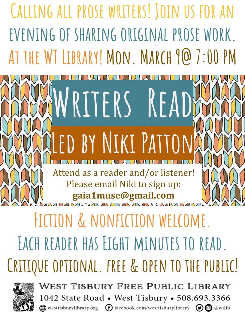 On Monday, March 9, at 7:00 PM, the West Tisbury Library will host its monthly “Writers Read” evening at the library. This event, led by Niki Patton, features community members reading short original prose pieces. Both fiction and nonfiction readings are welcome. Each reader is allotted eight minutes to read. Critique to follow reading is optional. Free and open to the public. Email Niki to be a reader or listener at this event: gaia1muse@gmail.com.